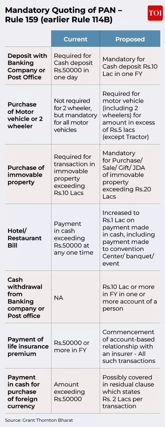 The draft Income Tax Rules 2026 also propose changes to the limits of several transactions where PAN Card number needs to be quoted. For example, presently if you deposit cash above Rs 50,000 in a day, you need to quote your PAN Card. Under the new rules, PAN Card will be mandatory for cash deposit of Rs 10 lakh in a financial year.